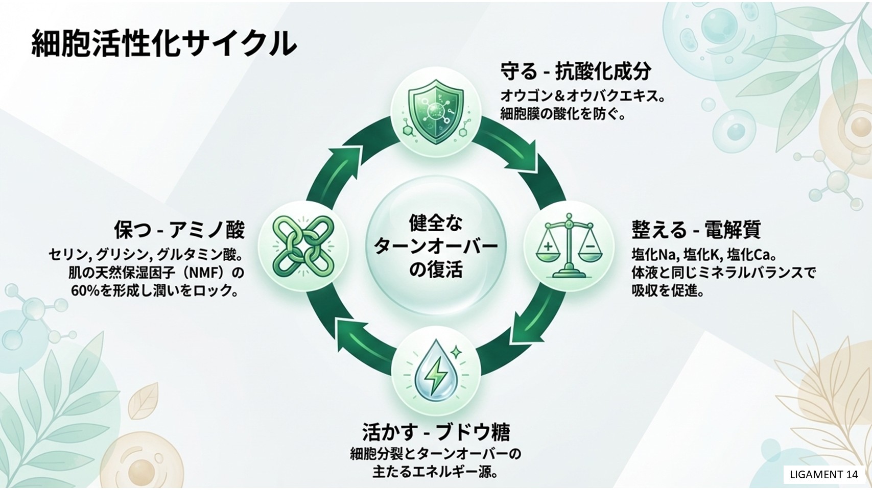 細胞の膜は脂質ですから酸化されないように抗酸化成分を、抗酸化成分やブドウ糖が、ナトリウムイオンやカリウムイオンを含む細胞の外の水分に素早くなじむように、塩化ナトリウム、塩化カリウム、塩化カルシウムを配合しています。アミノ酸は洗浄成分や水分保持として重要な成分です。
