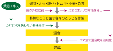 ほうろくにて2〜8時間(95〜98度)炭化しないように焙煎し、それぞれに適したこうじ菌を水分に浸した後にかけ、30〜32度で約72時間発酵させ、直ちに温度を下げます。約3週間自然乾燥させ、その後に特殊加工した葉緑エキスを加えて焙煎ゴマ油に浸して完成します。
